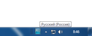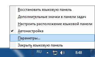 1. В правом нижнем углу экрана нажмите правой клавишей мышки на значок языка. Это может быть RU, EN и т.д.