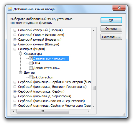 4. Если вы сделали всё правильно, должен открыться список с языками. Найдите язык Санскрит (Индия) и отметьте галочками так, как указано на картинке ниже. Далее нажмите Окей. И ещё раз Окей.