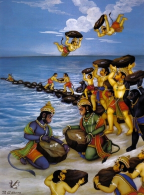 В Рамаяне описывается как преданные Господа Рамы строили знаменитый Мост Рамы через океан. Чтобы камни не тонули в воде, они писали на них Святое Имя Рамы.