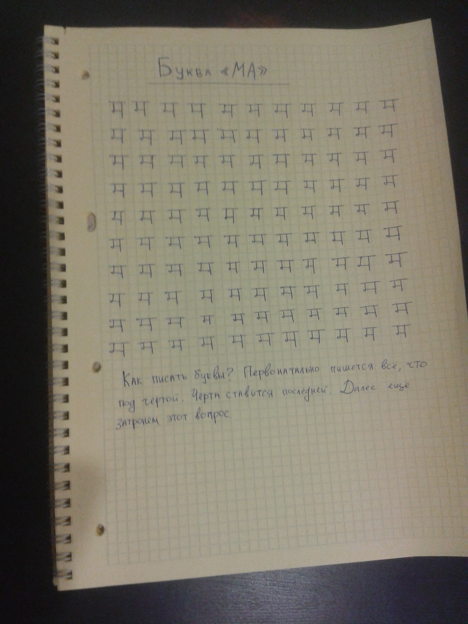 Сначала пишется основная часть каждой буквы — все её элементы, расположенные ниже. И только когда все буквы слова написаны, их соединяют сверху одной сплошной горизонтальной линией.