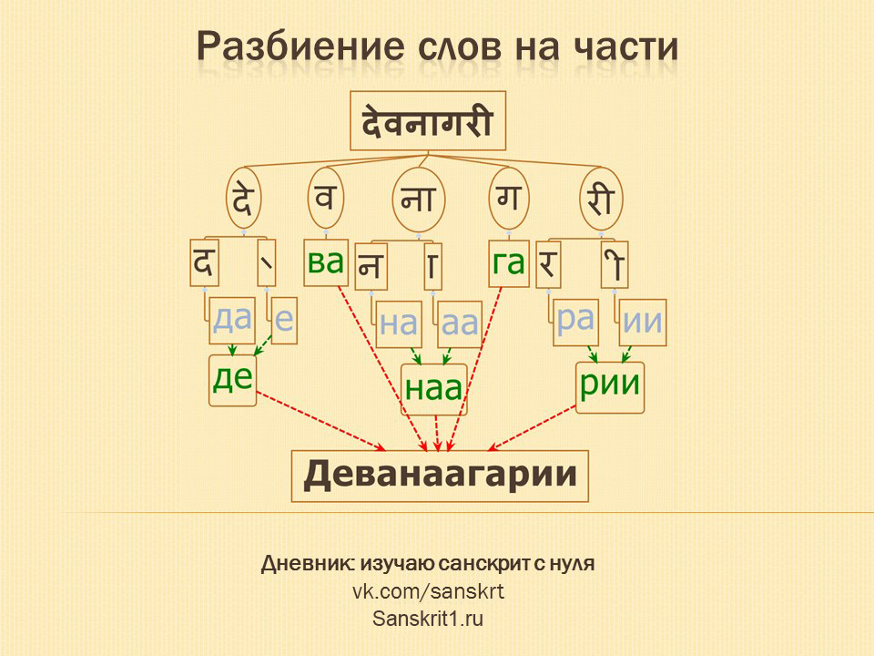 Пример разбиения слов на части в деванагари.