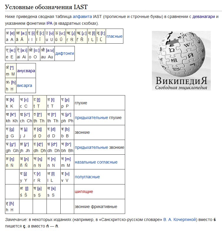 Международный алфавит транслитерации санскрита IAST ВикипедияДеванагари позволяет кодировать огромное количество звуков, отсутствующих в русском языке. Чтобы правильно записать латинскими буквами транслитерацию Деванагари используют IAST, международный алфавит транслитерации Санскрита.